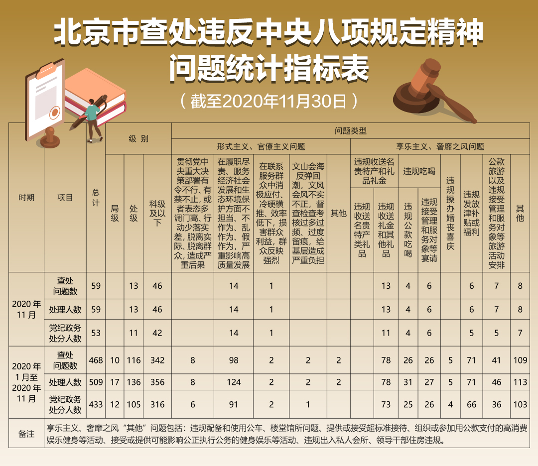 日前,北京市紀(jì)委監(jiān)委公布今年1月至11月查處違反中央八項規(guī)定精神問題統(tǒng)計指標(biāo)表。截至11月30日,北京市累計查處違反中央八項規(guī)定精神問題468個,處理509人,其中局級17人、處級136人、科級及以下356人。