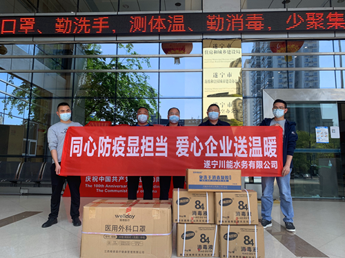 獻(xiàn)愛心,共防疫。為積極支持遂寧市住建系統(tǒng)防疫工作,切實(shí)履行國有企業(yè)社會責(zé)任。4月7日,受四川省環(huán)保產(chǎn)業(yè)集團(tuán)副總經(jīng)理、遂寧川能水務(wù)有限公司黨支部副書記(主持工作)、董事長付孝磊同志委托,遂寧川能水務(wù)有限公司副總經(jīng)理、工會主席何清明同志帶隊(duì)到遂寧市住房和城鄉(xiāng)建設(shè)局捐贈84消毒液、免洗手消毒凝膠、口罩等防疫物資。