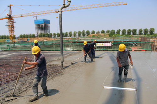 在體育公園施工現(xiàn)場,工人們有的進(jìn)行鋼筋切割,有的忙著綁扎鋼筋,有的澆灌筏板、填滿空隙、整平漿面、測量厚度、鋪設(shè)薄膜,200余名施工人員各司其職,緊張有序趕超進(jìn)度,運(yùn)輸車輛川流不息,施工機(jī)械轟鳴,塔吊來回轉(zhuǎn)運(yùn)物料,整個(gè)施工現(xiàn)場如火如荼、熱火朝天。