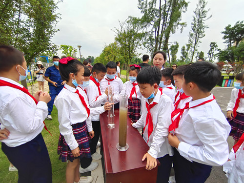 學(xué)生們觀看污水處理前、后水質(zhì)情況
