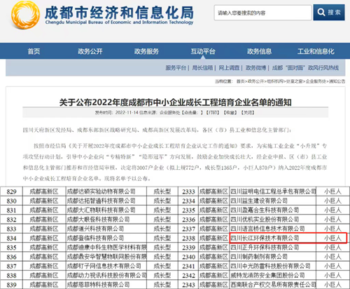 近日,成都市經(jīng)濟和信息化局公布了2022年度成都市中小企業(yè)成長工程培育企業(yè)名單,四川環(huán)保所屬長江環(huán)保公司入選名單,成功入庫“小巨人”企業(yè)行列。